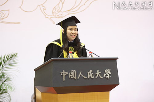 博士畢業生代表喬婧思向母校、恩師、家長、同學表示感謝?!爱斘覀冏叱鲂@時,人大給予我們終身取之不盡的精神寶庫,將指引我們在更廣闊的天地間不倦求索?!?她表示,身為人大人,在人大培養了實事求是的精神和堅忍不拔的態度,踐行了勇于創新、敢于擔當的拼搏精神,學到了胸懷寬廣、團結務實的人生態度。希望大家在接下來的人生路上,力爭成為“國民表率、社會棟梁”,為祖國的繁榮發展貢獻力量。