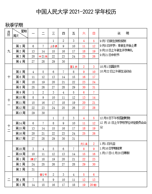 中國人民大學2021-2022學年校歷